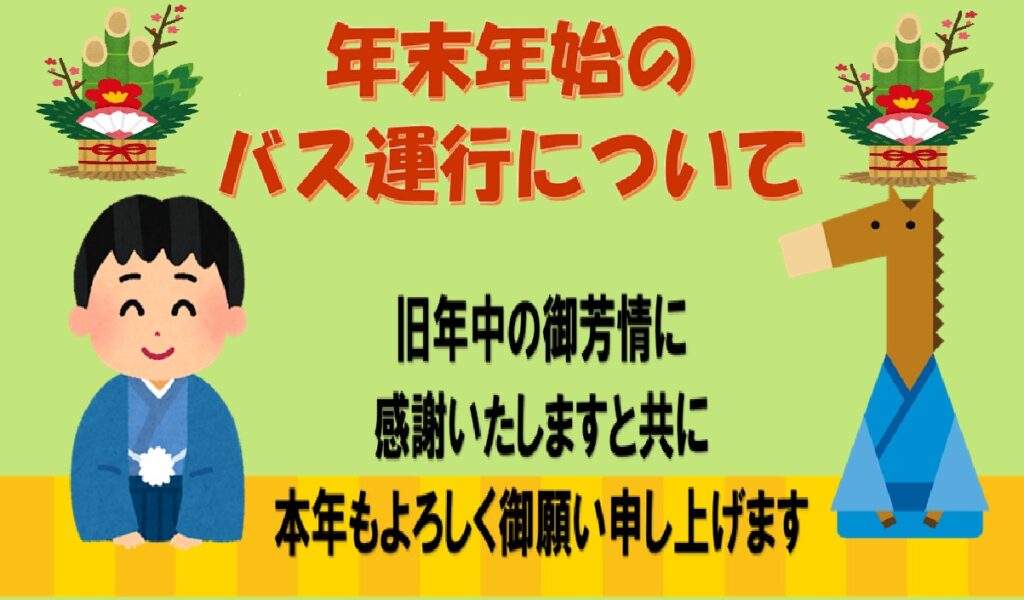 年末年始のバス運行について お知らせ 2025.12.17 日頃より、弊社バスをご利用いただき誠にありがとうございます。 年末年始バス運行につきまして、次のとおりとさせていただきます。 令和7年12月31日(水):土祝日ダイヤ 令和8年1月1日(木):運休 令和8年1月2日(金):土祝日ダイヤ ご不明な点などありましたら、お気軽にお問合せ下さい。(宇久観光バス 電話:0959-57-2020)